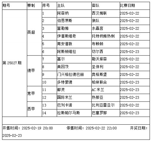 传足胜负彩第25027期竞猜赛事中不乏豪门出战:英超方面,阿森纳主场对阵西汉姆,切尔西客场挑战维拉;意甲,国际米兰主场迎来热那亚;西甲赛场上,巴萨客场面对拉斯帕尔马斯。