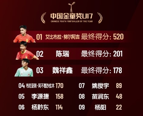 2月21日讯 足球周刊今日公布中国金球奖具体的相关得分,其中金童奖具体得分如下: