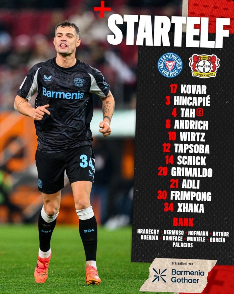 2月22日讯 今天晚上,勒沃库森将在客场对阵荷尔斯泰因基尔,双方俱乐部分别在官方社媒上公布了比赛的首发阵容。