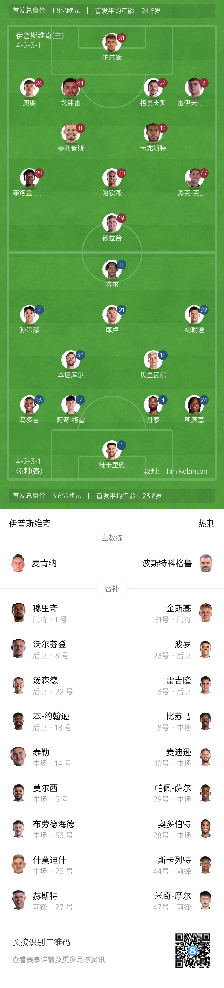 热刺vs伊普斯维奇首发:孙兴慜、特尔先发,库卢、约翰逊登场