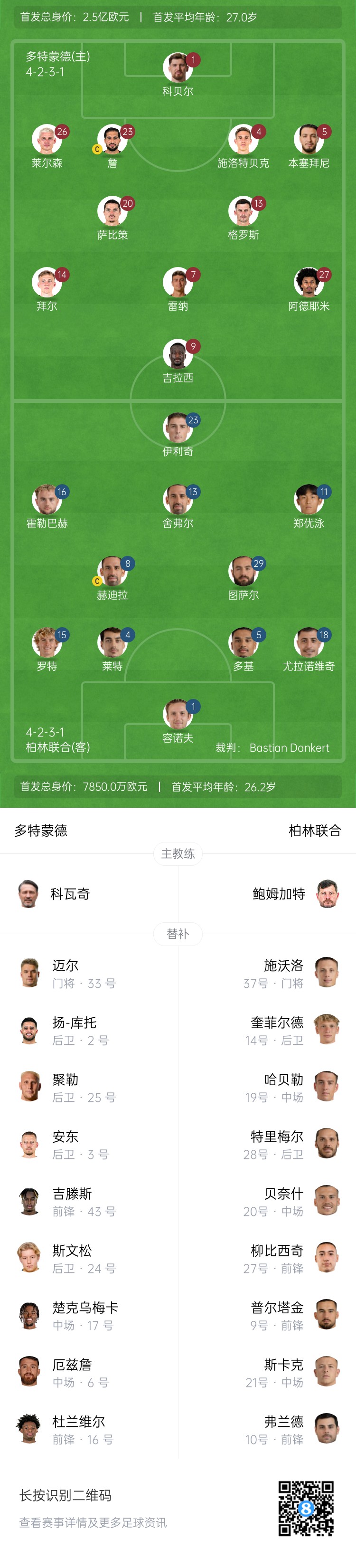 多特vs柏林联合首发:吉拉西、阿德耶米先发,科贝尔、萨比策出战