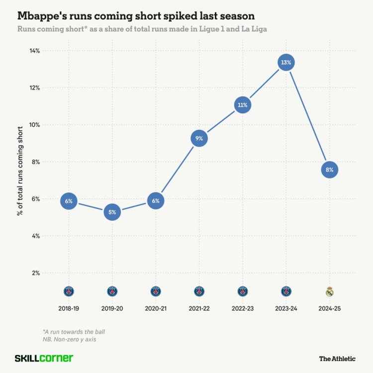 本赛季,姆巴佩更多地进入禁区进行跑位