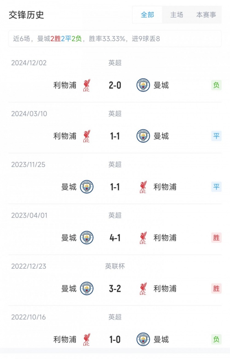 曼城vs利物浦交锋历史:利物浦历史占优,近6次交手双方各取2胜