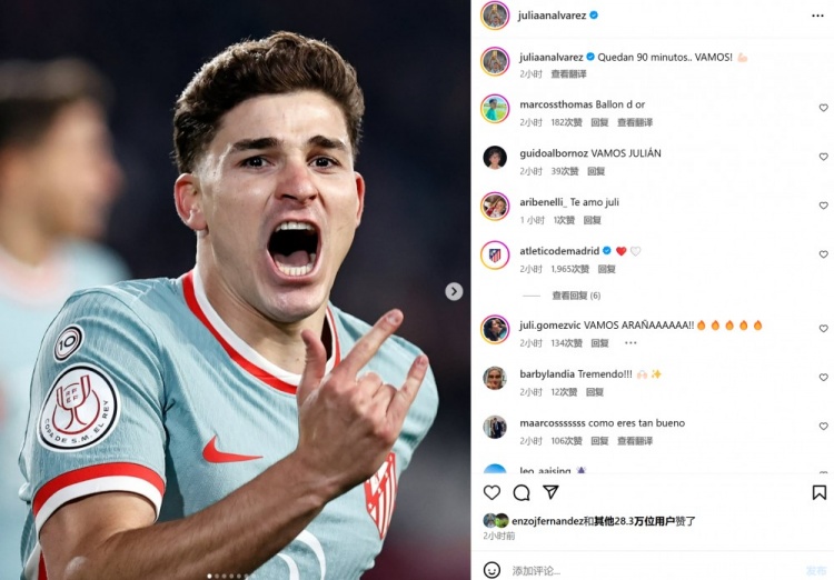 本场比赛阿尔瓦雷斯一传一射表现出色,赛后他也在个人社媒晒出本场庆祝进球的照片,配文写道:“还有90分钟比赛,我们继续加油!”