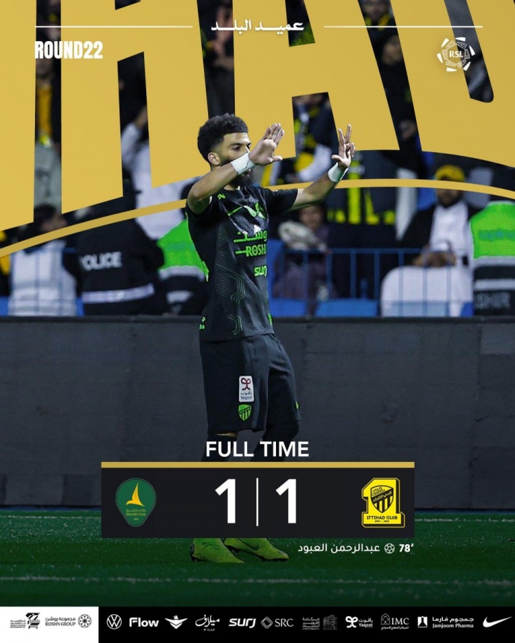 吉达联合客场1-1战平卡利杰,联赛4连胜终结。