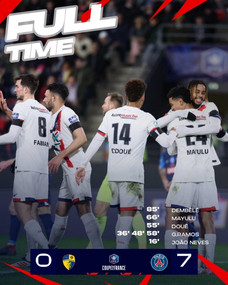 法国杯-巴黎7-0大胜布里欧齐 贡萨洛-拉莫斯3射1传杜埃1射2传