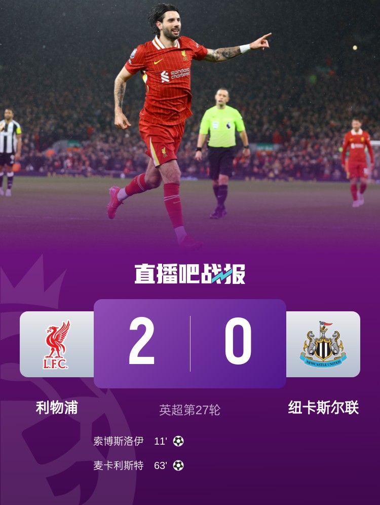 索博斯洛伊、麦卡利斯特破门,利物浦主场2-0战胜纽卡,多赛一场领先阿森纳13分。