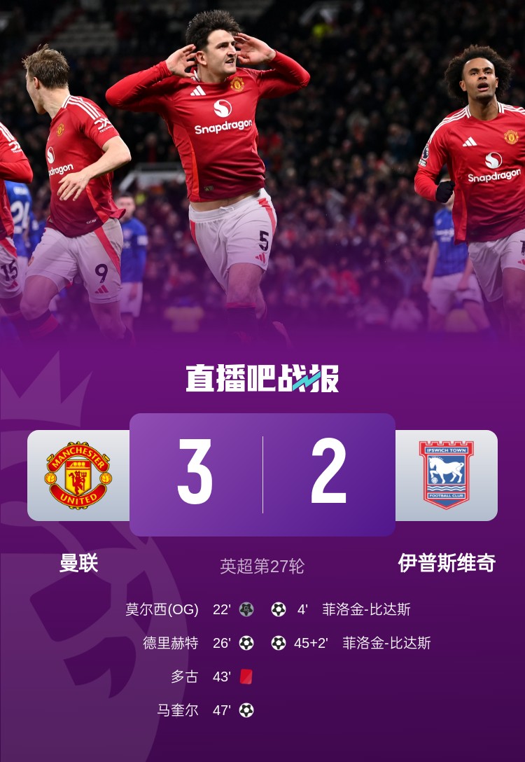 多古送礼+染红,马奎尔头球破门,曼联3-2逆转伊普斯维奇。