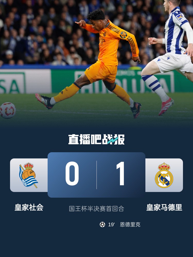恩德里克制胜,皇马1-0皇家社会占得先机。