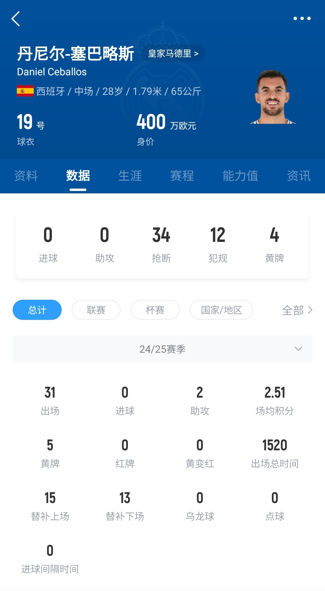 塞巴略斯本赛季是皇马重要的轮换球员,总共出场31次,贡献2次助攻。