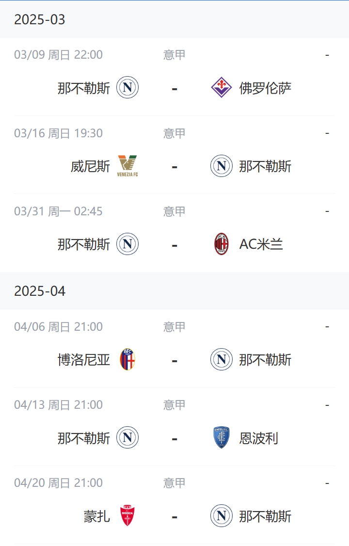 那不勒斯未来两月赛程