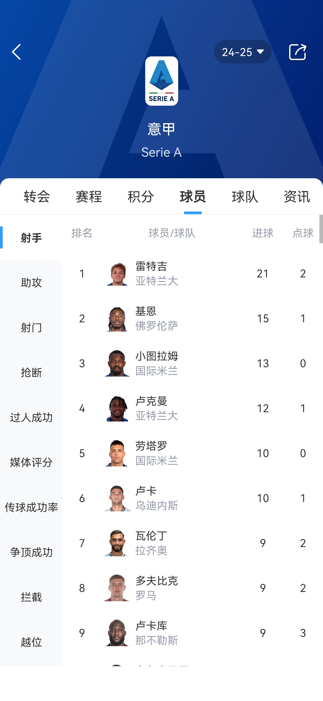 意甲射手榜:
