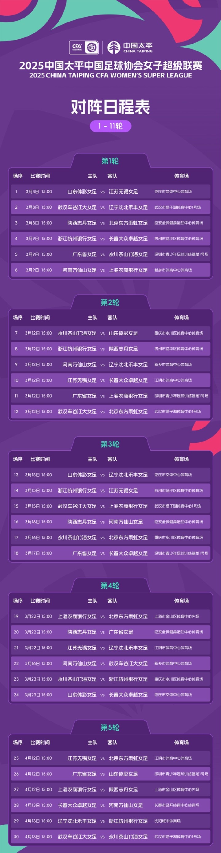 2025中国太平中国足球协会女子超级联赛对阵日程表来了,新赛季3月8日重新登场,敢耀未来!