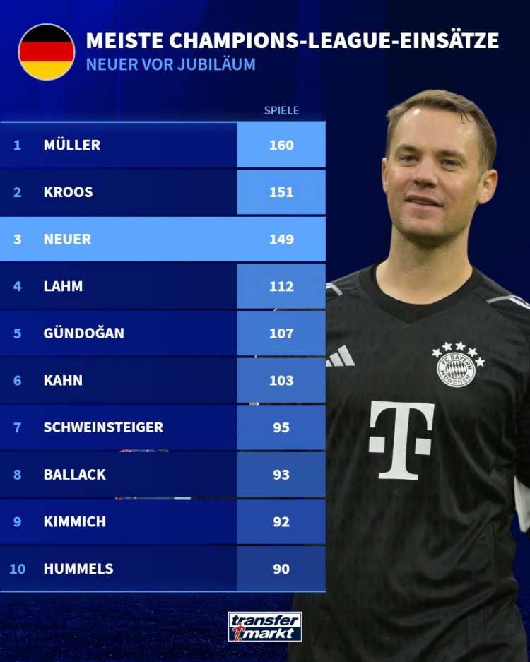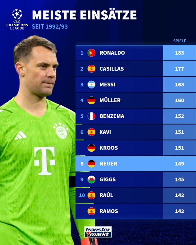 目前,诺伊尔是欧冠出场第三多的德国球员,也在欧冠历史出场次数榜中排名第8。