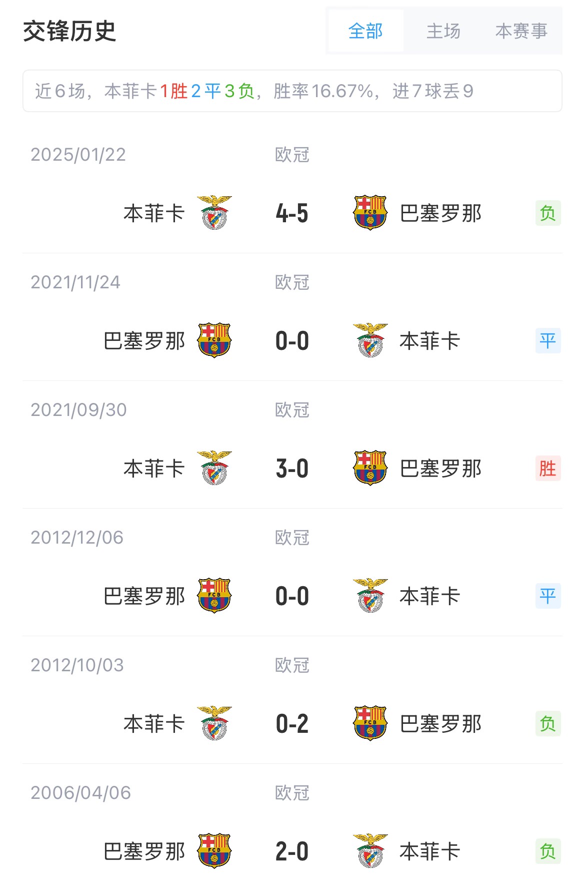 巴萨与本菲卡历史共交手10次,巴萨4胜4平2负。两队本赛季欧冠联赛阶段同组,巴萨客场5-4绝杀本菲卡。