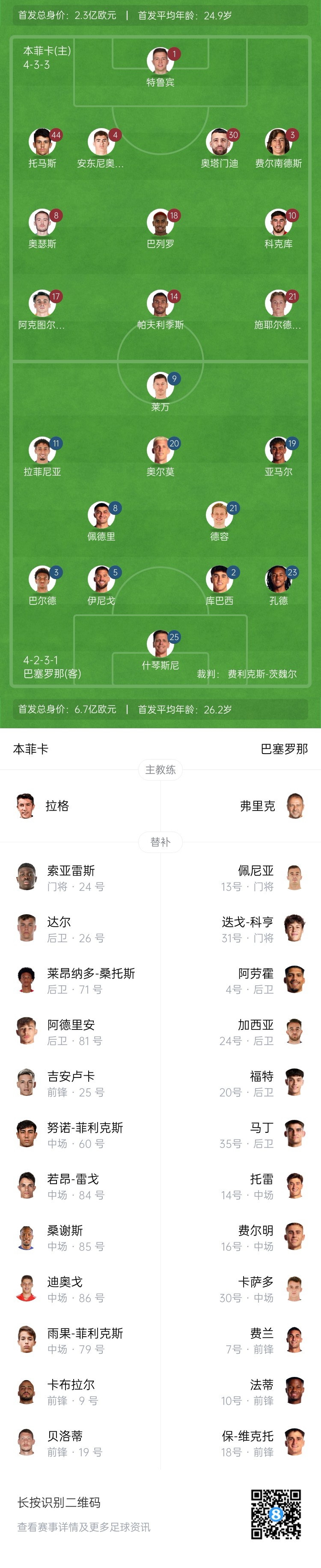 巴萨首发:25-什琴斯尼、2-库巴西、3-巴尔德、5-伊尼戈-马丁内斯、23-孔德、8-佩德里、21-德容、20-奥尔莫、19-亚马尔、11-拉菲尼亚、9-莱万