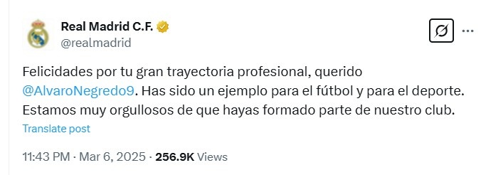 皇马官方祝福道:“祝贺内格雷多有着伟大的职业生涯,你是足坛和体坛的榜样。我们为你曾是我们俱乐部的一员感到非常的自豪。”