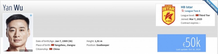 3月7日讯 根据德国转会市场网站信息显示,36岁的门将吴龑已经复出加盟了中乙湖北青年星。