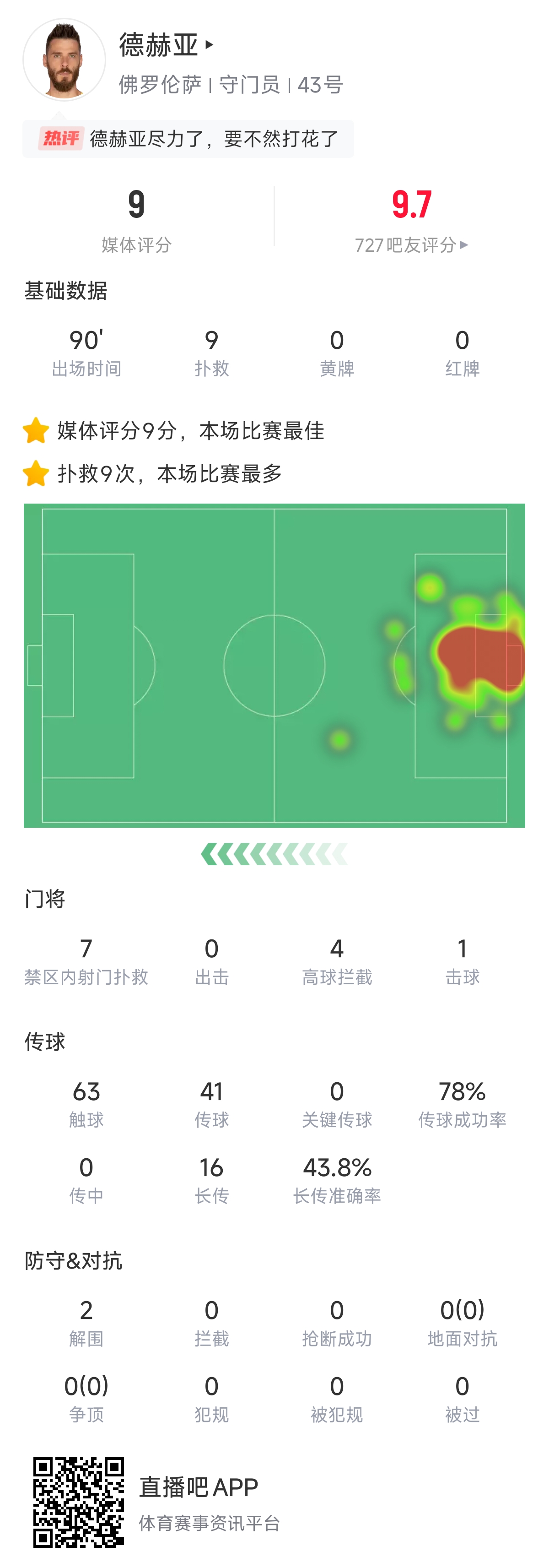 这场比赛那不勒斯一共打门19脚,其中11脚射正。德赫亚的数据为丢2球,9扑救,4高空拦截,1击球,2解围,触球多达63次。
