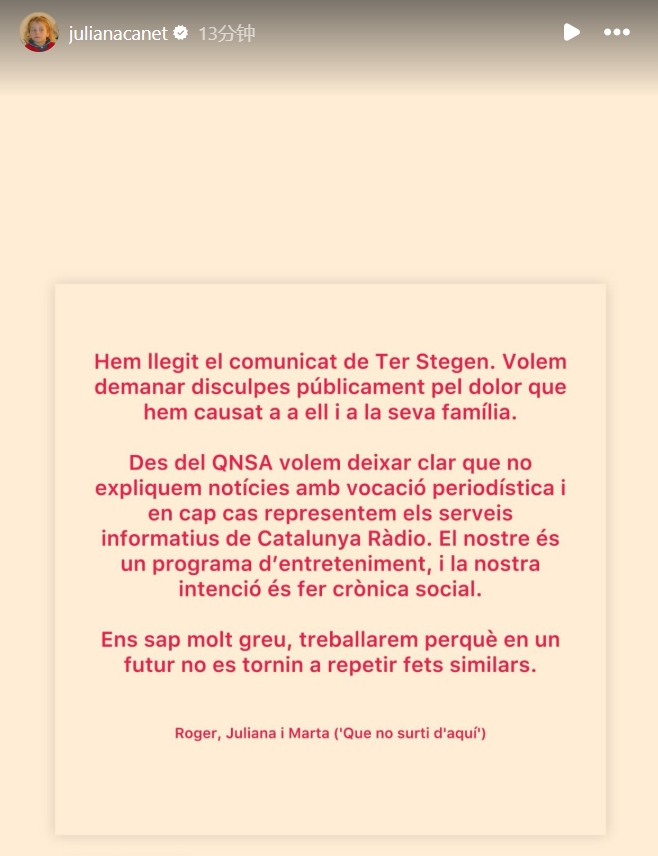 从节目《Que no surti d’aquí》的角度,我们想明确表示,我们并非以新闻视角报道事件,也不代表加泰罗尼亚广播电台的新闻服务。我们的节目是娱乐性质的,我们的目的是进行社会纪实。