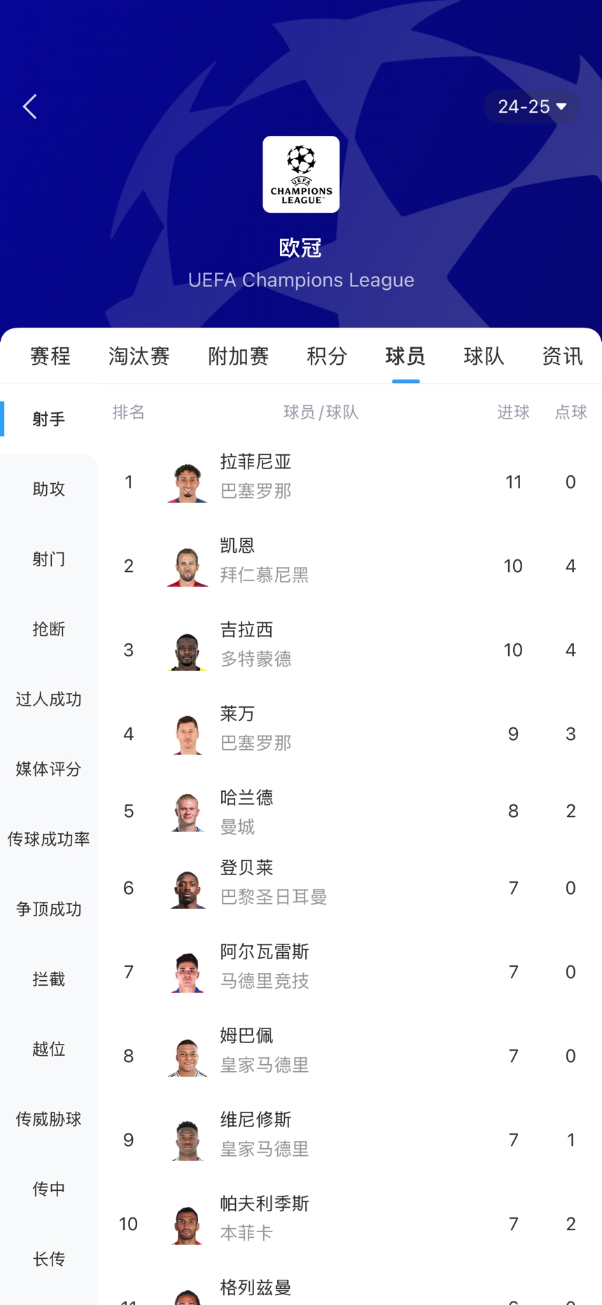 本赛季欧冠,拉菲尼亚出战10场贡献11球5助攻。