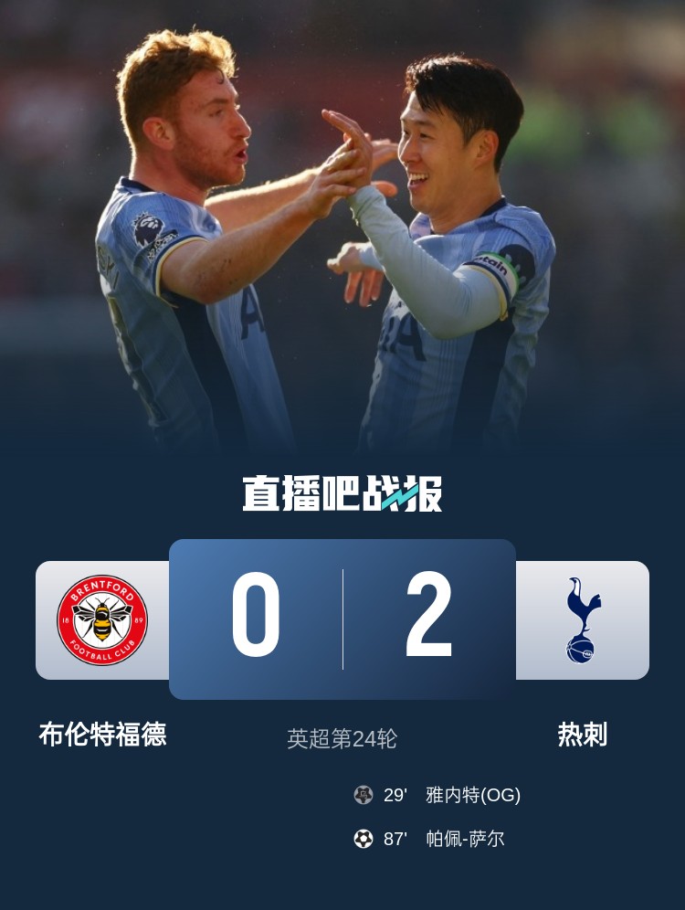 英超第24轮,热刺2-0击败布伦特福德。上半场,孙兴慜角球制造乌龙,雅内特将球碰进自家球门;下半场,维萨错失门前近距离机会,孙兴慜助攻萨尔锁定胜局。
