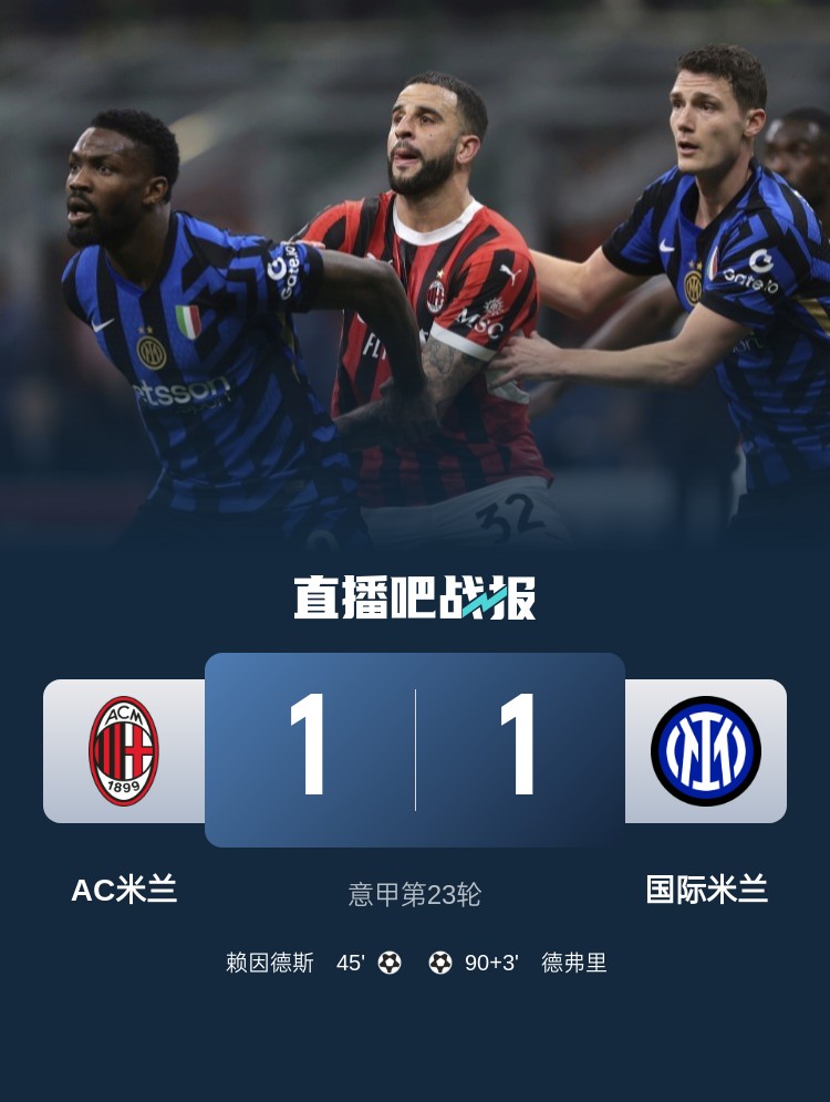 意甲第23轮,AC米兰1-1国际米兰。上半场,迪马尔科、劳塔罗两度破门无效,赖因德斯补射打破僵局;下半场,劳塔罗再度进球被吹,比塞克、图拉姆和邓弗里斯三度中柱,扎莱夫斯基助攻德弗里补时扳平。