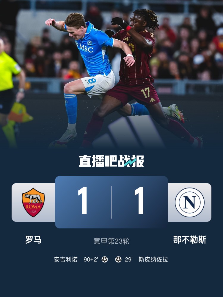 意甲第23轮,罗马1-1那不勒斯。上半场,斯皮纳佐拉挑射建功;下半场,伤停补时阶段安吉利诺凌空绝平。