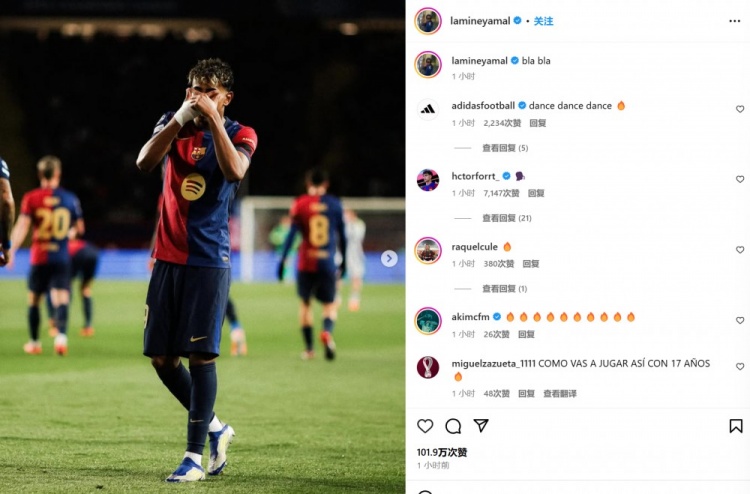 亚马尔还通过社媒晒出自己的庆祝照,并配文:“bla bla”,似乎是在回击近期对他的质疑。