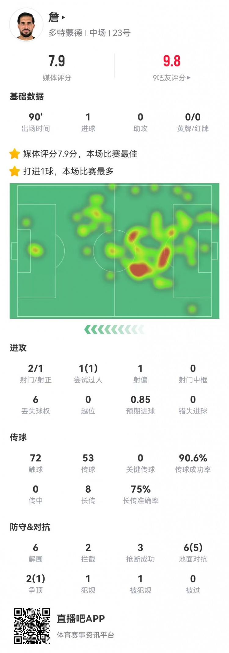 官方:埃姆雷-詹当选全场最佳,点射扳平+6解围2拦截3抢断