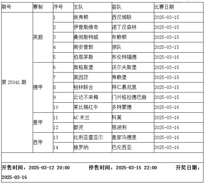 本周末的 传足胜负彩第25041期中不乏焦点:英超,曼城主场对阵布赖顿;德甲,拜仁慕尼黑客场出征柏林;意甲,AC米兰主场迎战科莫;西甲,皇马做客对垒比利亚雷亚尔。