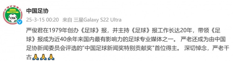 3月15日讯 《足球》报官方发布讣告,《足球》报创刊人严俊君因病离世,享年86岁。中国足协发文进行悼念。