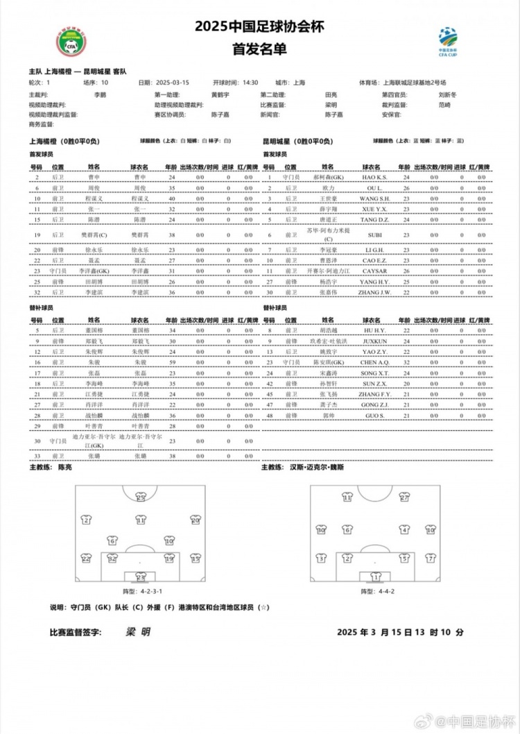 3月15日讯 2025年中国足协杯第1轮迎来第2个比赛日的较量,上海橘橙将在今天下午14:30主场迎战昆明城星。赛前公布的出场名单中,59岁的朱骏位列替补。