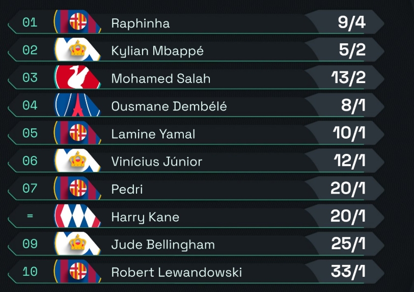 金球奖赔率:拉菲尼亚居首、姆巴佩第二,皇萨球员7人进前十