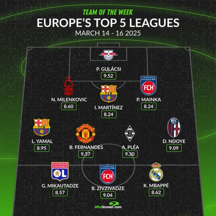 whoscored本周五大联赛最佳阵:B费领衔,姆巴佩、亚马尔在列