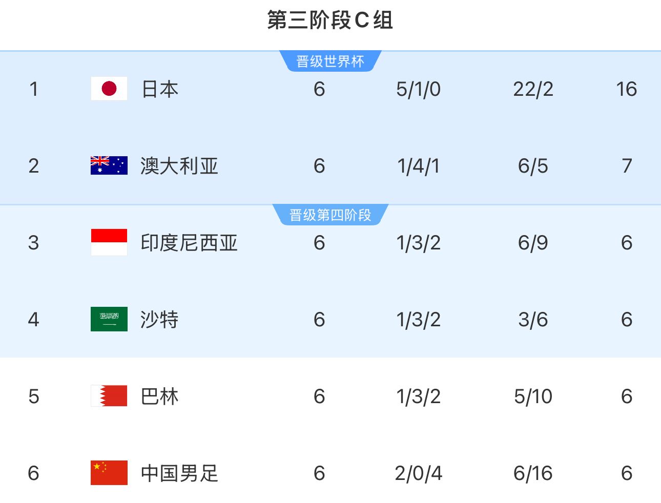 目前在18强赛C组积分榜,国足积6分暂居最后一位,不过与排在第二位的澳大利亚仅仅差1分,沙特则同积6分排在第4位。