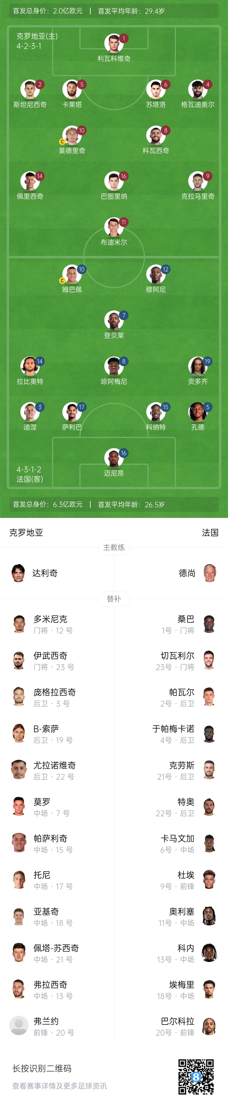 法国替补:1-桑巴、23-切瓦利尔、2-帕瓦尔、4-于帕梅卡诺、21-克劳斯、22-特奥、6-卡马文加、9-杜埃、11-奥利塞、13-科内、18-埃梅里、20-巴尔科拉