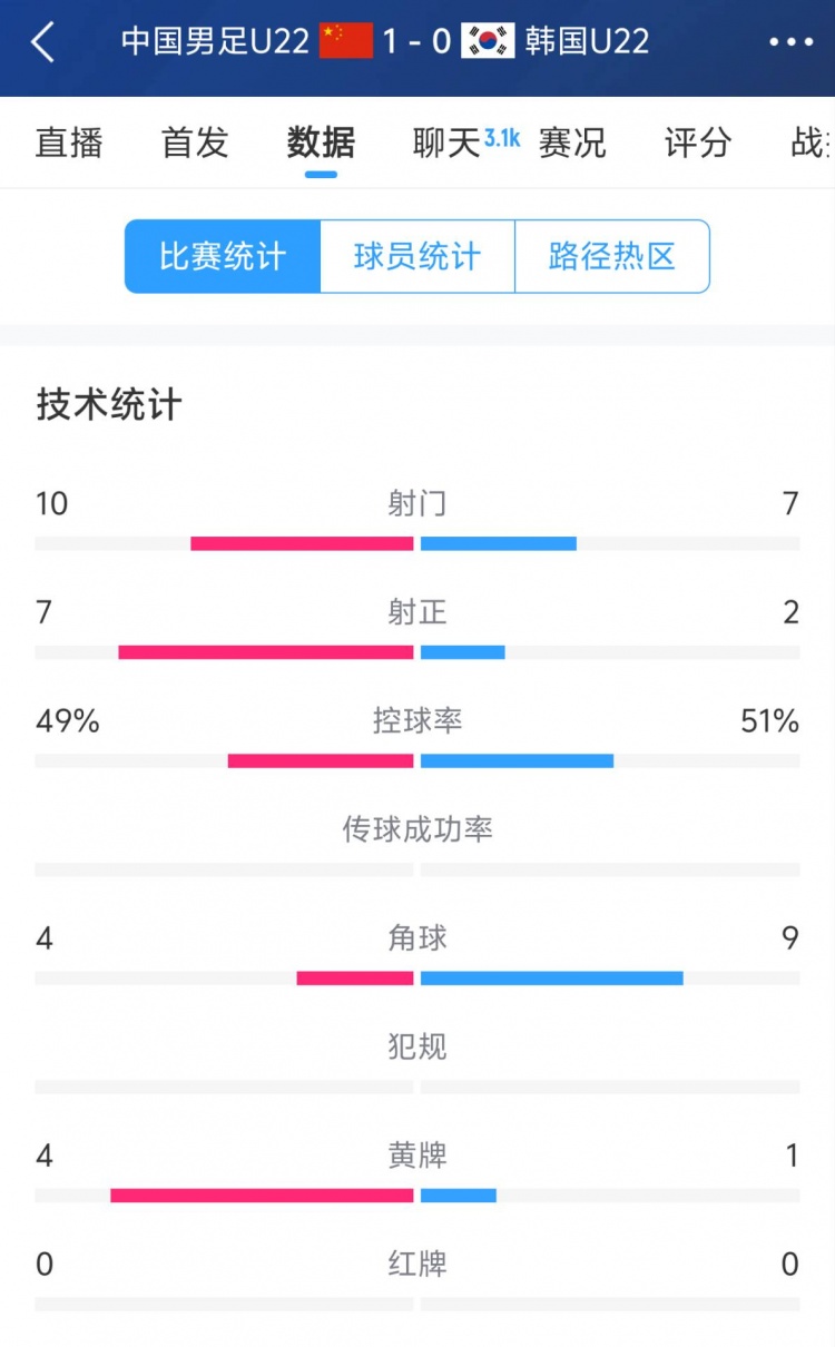U22国足1-0韩国全场数据:控球率49%落后韩国,10射7正领先对手
