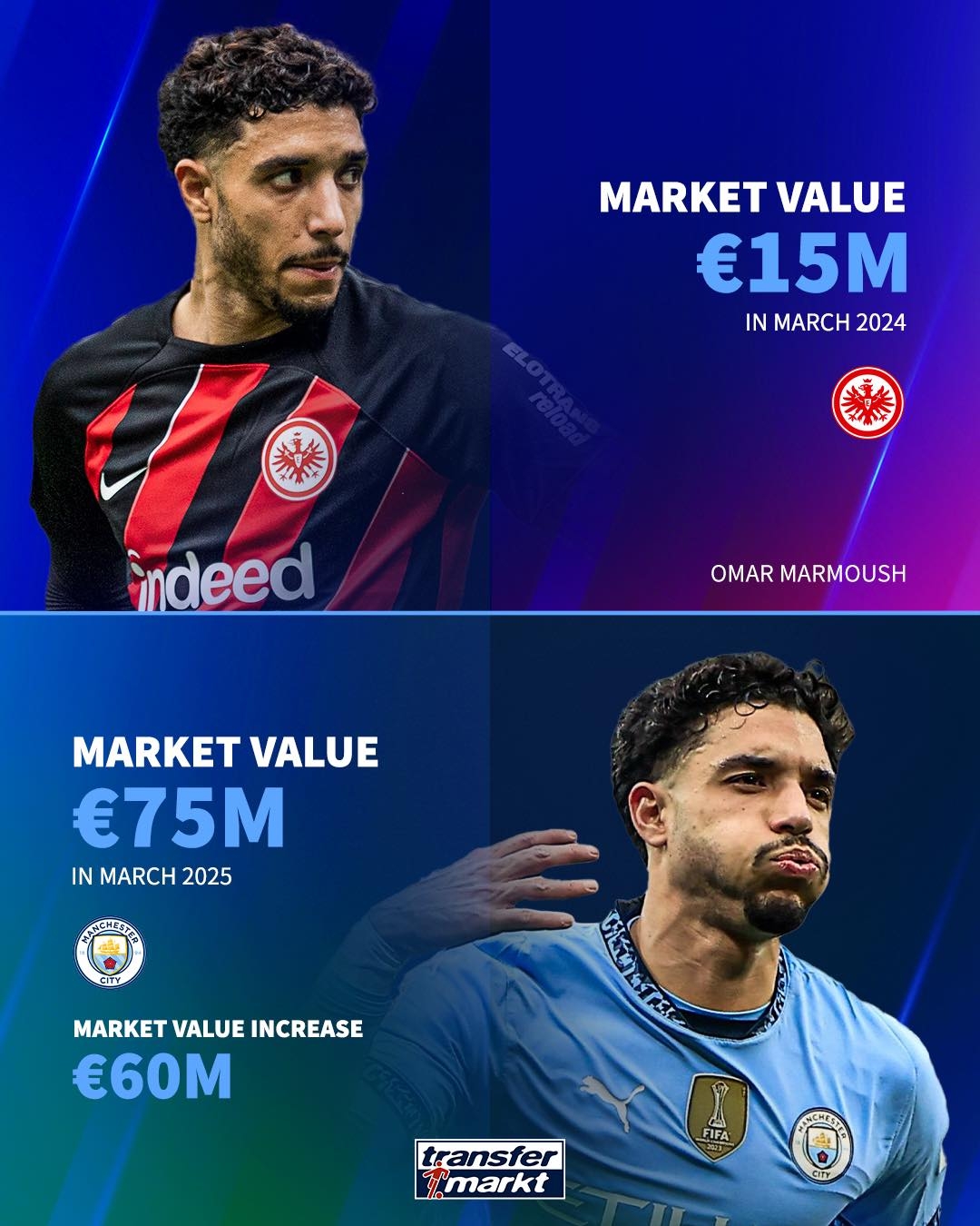 英超球员过去1年身价涨幅:帕尔默暴涨8500万欧 马尔穆什涨6000万
