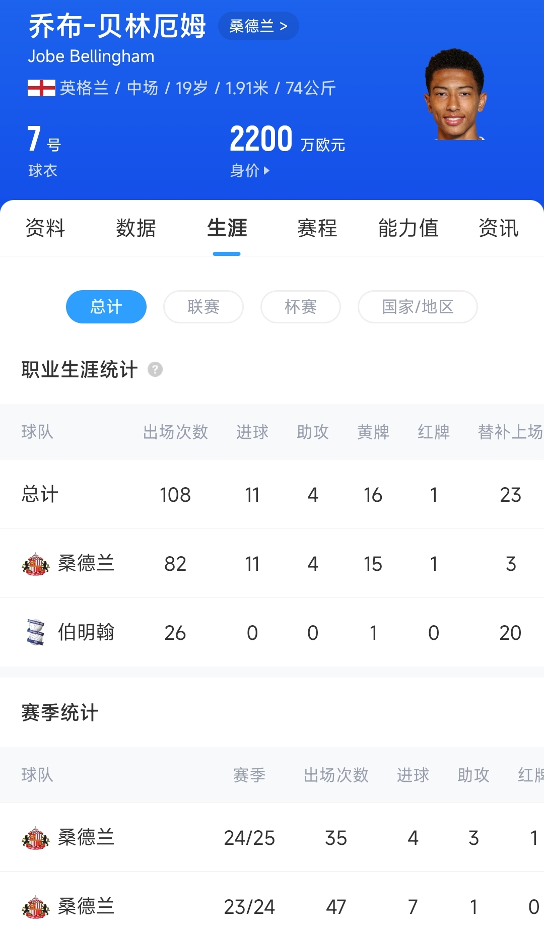 乔布-贝林厄姆是皇马中场祖德-贝林厄姆的弟弟,本赛季小贝林厄姆代表桑德兰出战35场比赛,贡献4球3助。本周稍早时候,小贝林厄姆代表英格兰U21首发出战70分钟,帮助球队4-2战胜葡萄牙U21。