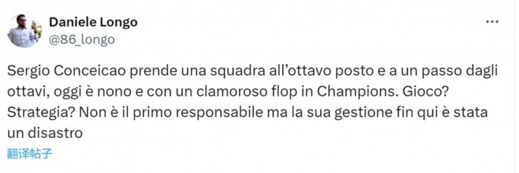 隆戈写道:“孔塞桑接手了一支排名联赛第8名,并且几乎晋级欧冠16强的球队,如今球队排名联赛第9名,欧冠惨淡出局。比赛风格?战术策略?他不是首要责任人,但到目前为止,他的执教是一场灾难。”