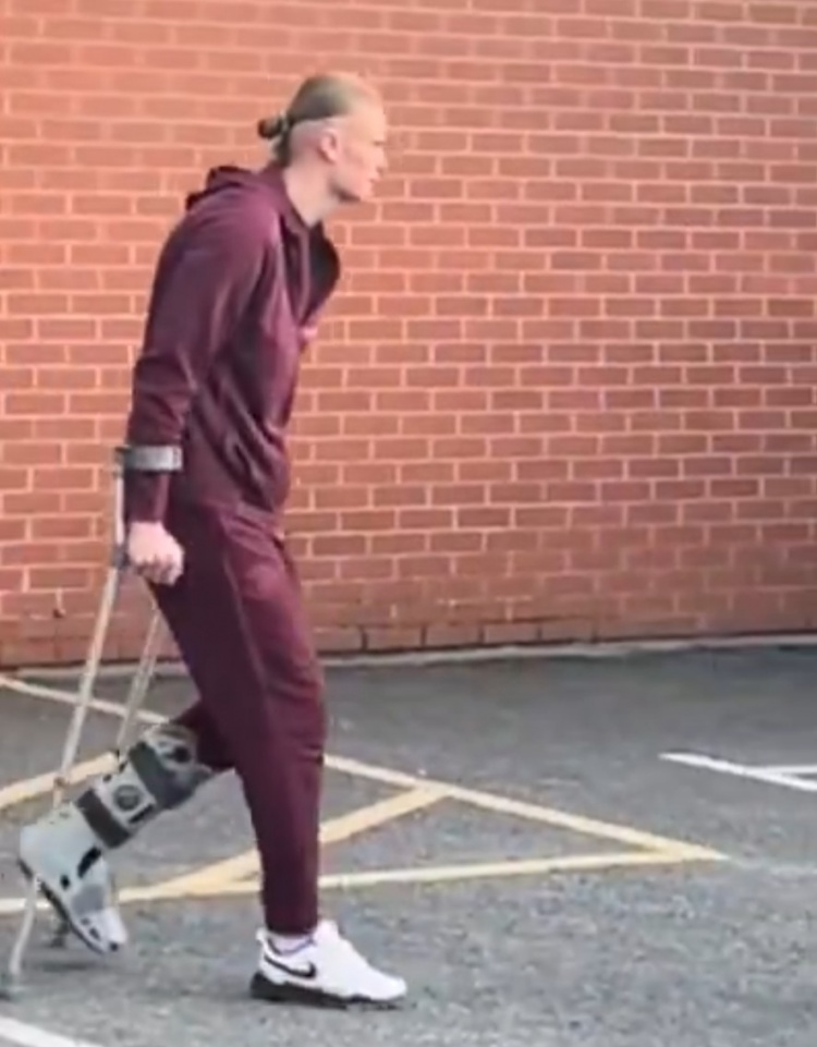 据悉,哈兰德离开球场时看起来没有表现出痛苦,但他拄着拐杖,左腿穿着防护靴行走。