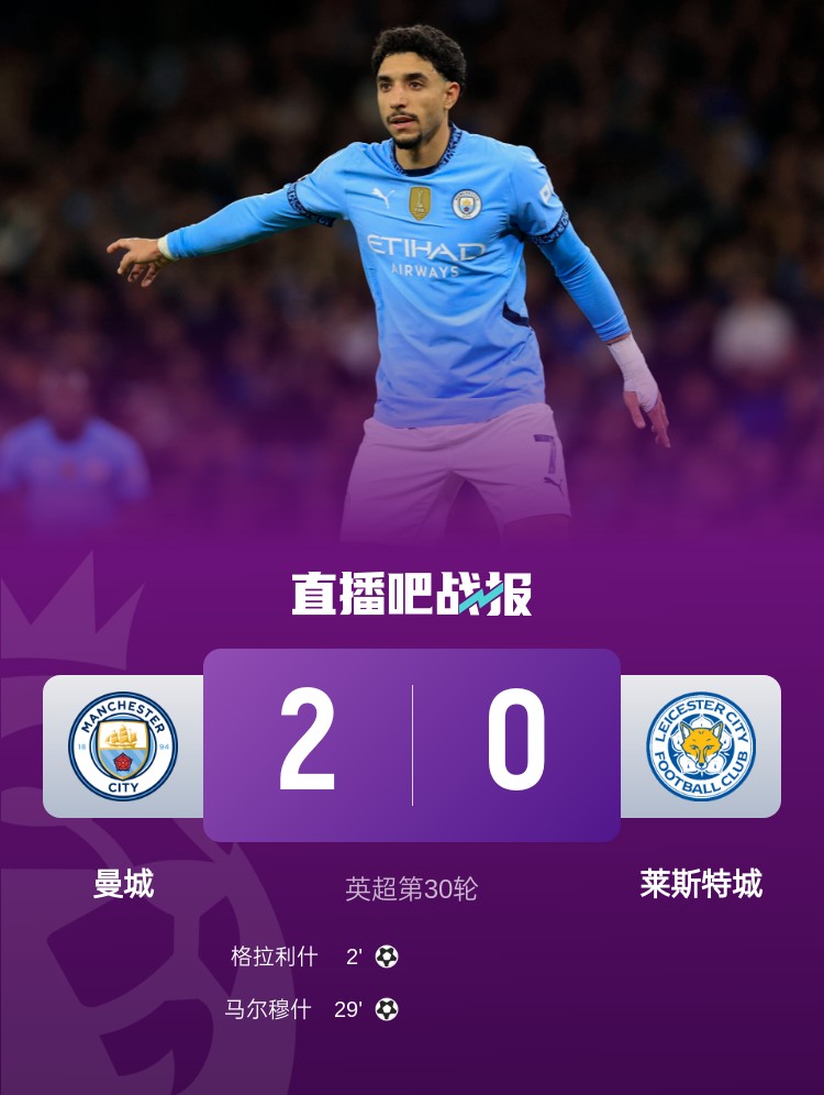 格拉利什闪击破门,马尔穆什扩大领先优势,曼城2-0击败莱斯特城。
