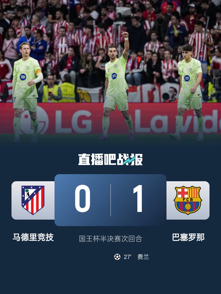 费兰制胜,巴萨客场1-0战胜马竞,总比分5-4淘汰马竞进军国王杯决赛,将对阵皇马。