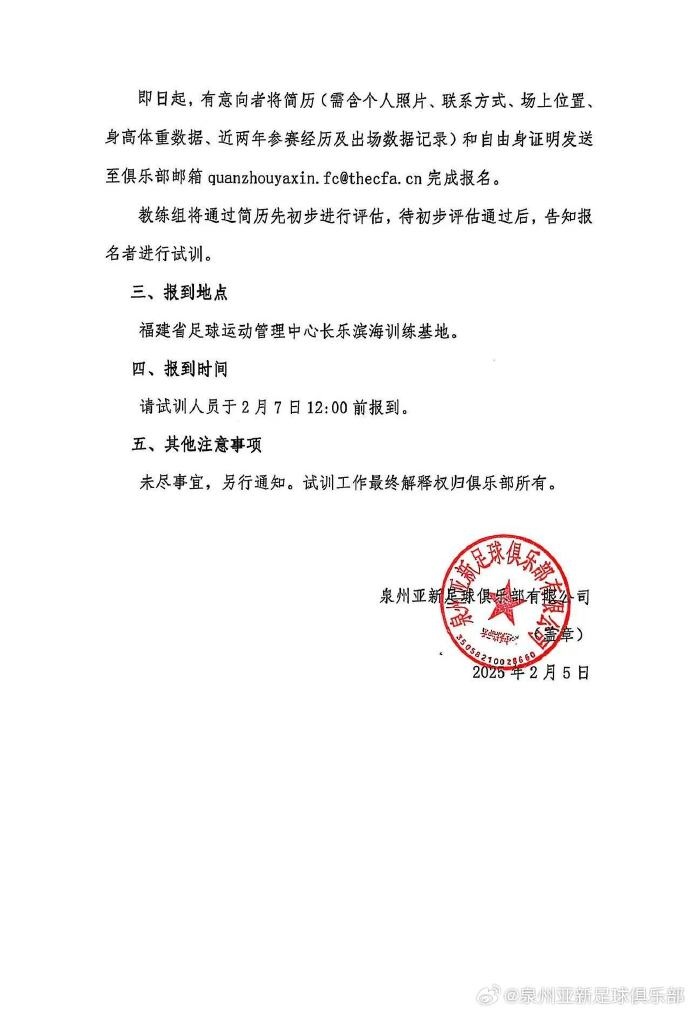 泉州亚新官方表示,为备战新赛季中乙联赛及中国足协杯,补充提升球队实力,俱乐部决定公开招募优秀足球运动员。