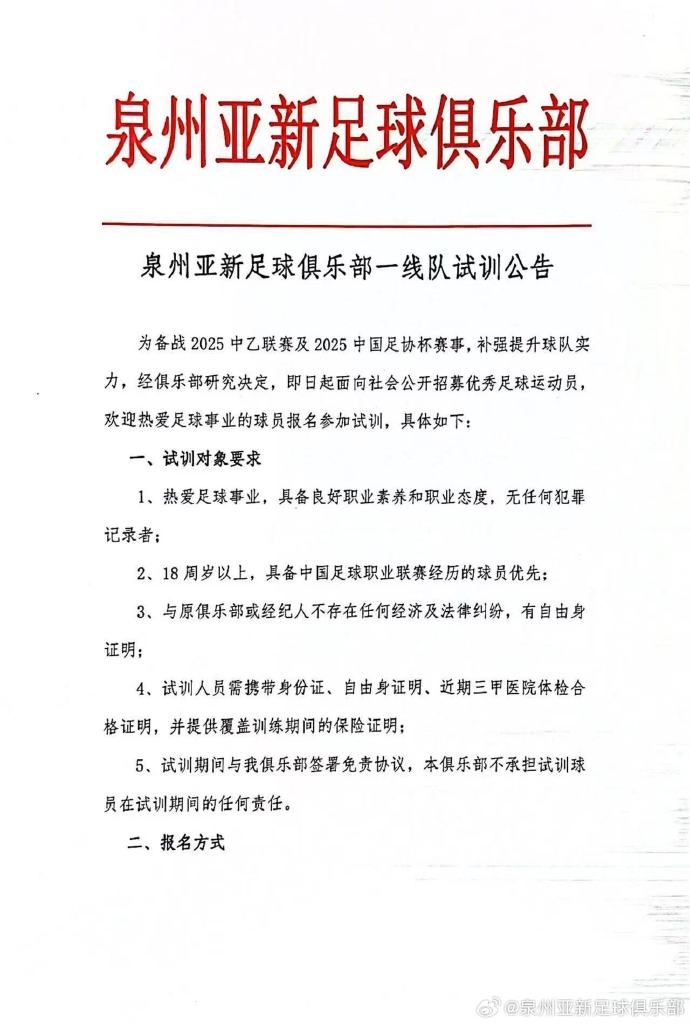 中乙泉州亚新发布试训公告:职业联赛经历者优先 有自由身证明