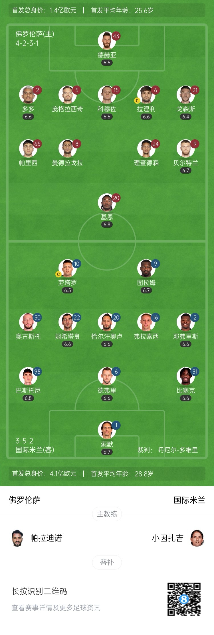 佛罗伦萨首发:43-德赫亚、15-科穆佐、5-庞格拉契奇、6-卢卡-拉涅利、21-戈森斯、2-多多、8-曼德拉格拉、24-迈克尔-理查森、65-帕里西、9-贝尔特兰、20-基恩