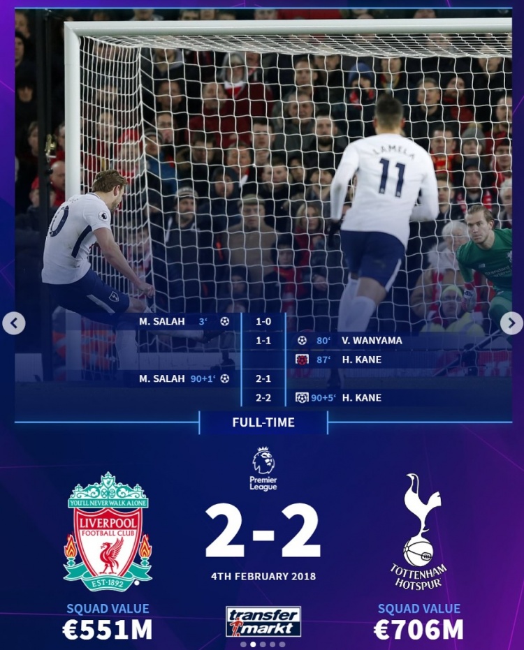 2018年2月,英超:利物浦主场2-2热刺。萨拉赫开场闪击,万亚马替补世界波扳平,凯恩第87分钟失点,萨拉赫第91分钟“绝杀”,凯恩第95分钟再次主罚点球完成绝平。