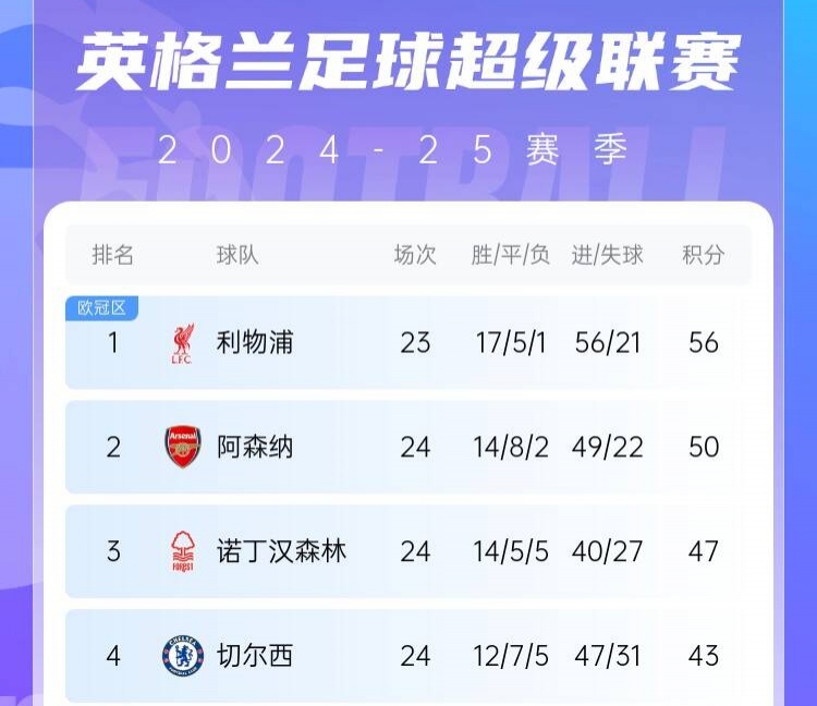 利物浦出局之后,在足总杯赛场上,英超前4名已经有3队被淘汰:第一利物浦,第二阿森纳和第四的切尔西。目前仅剩第三的诺丁汉森林,他们将在后天凌晨对阵英甲球队埃克塞特城。