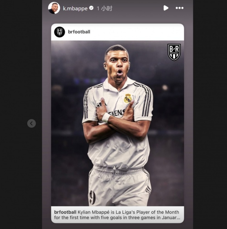 3场5球被评为西甲1月最佳球员!姆巴佩社媒转发纪念